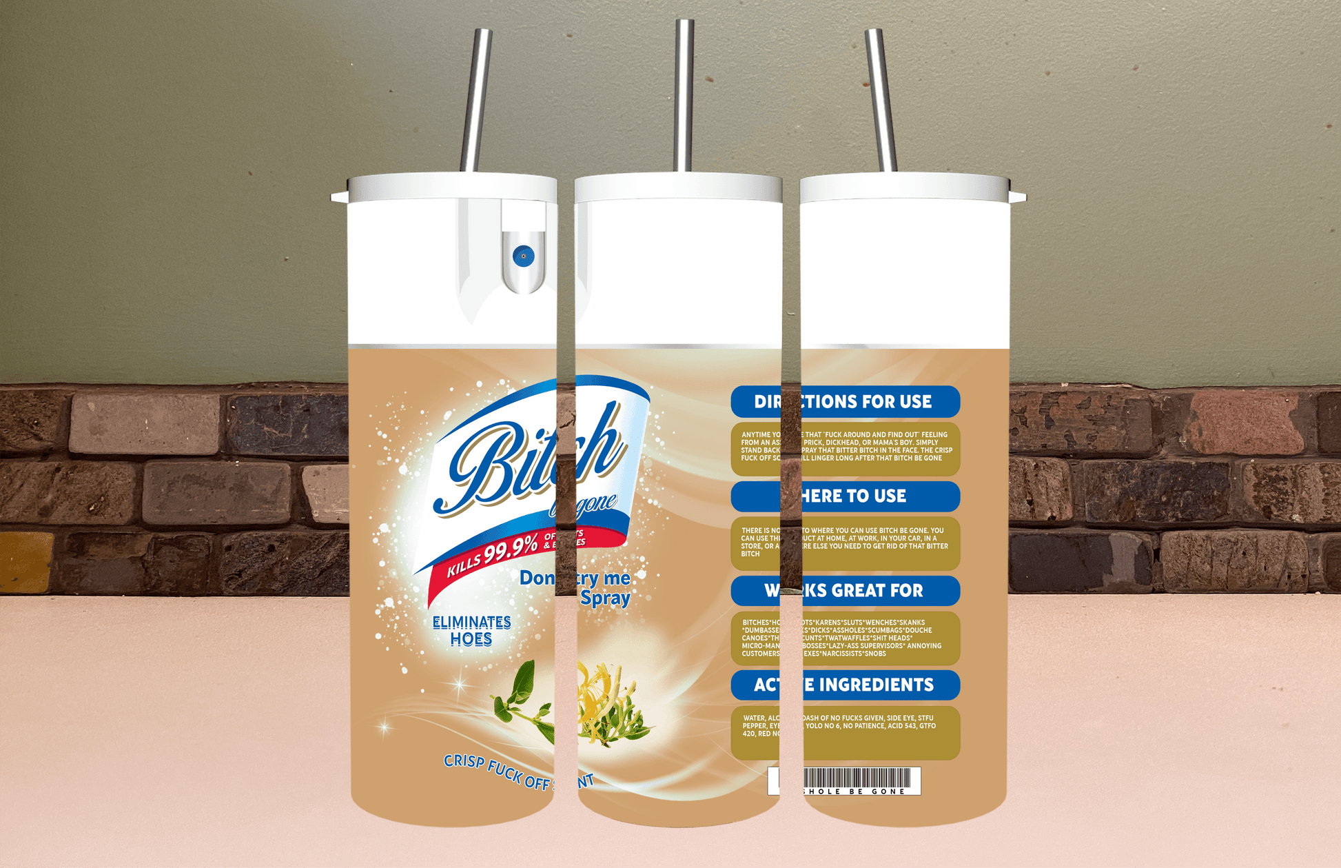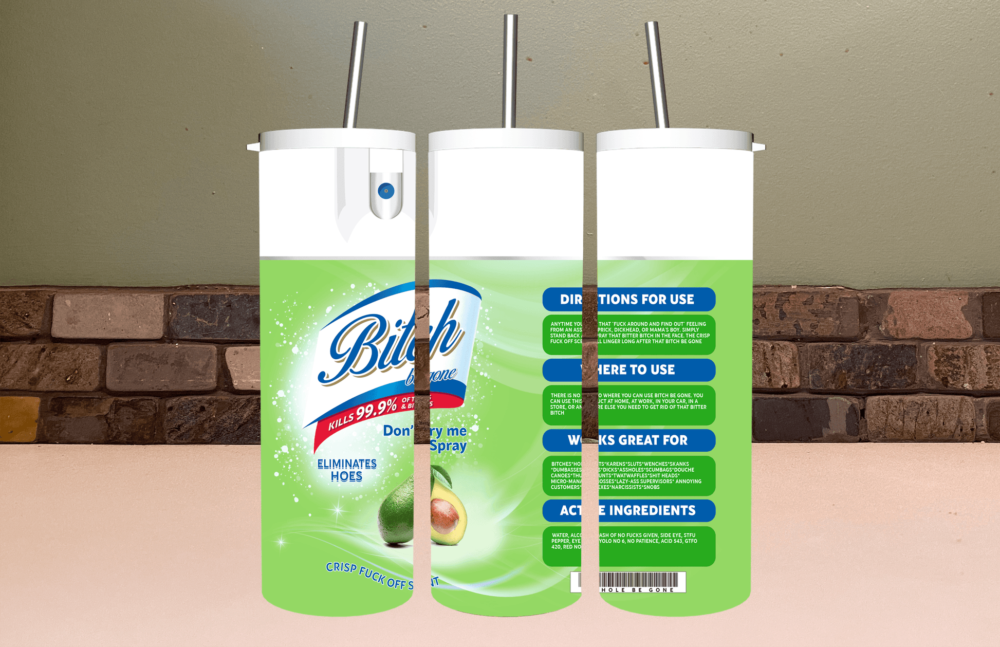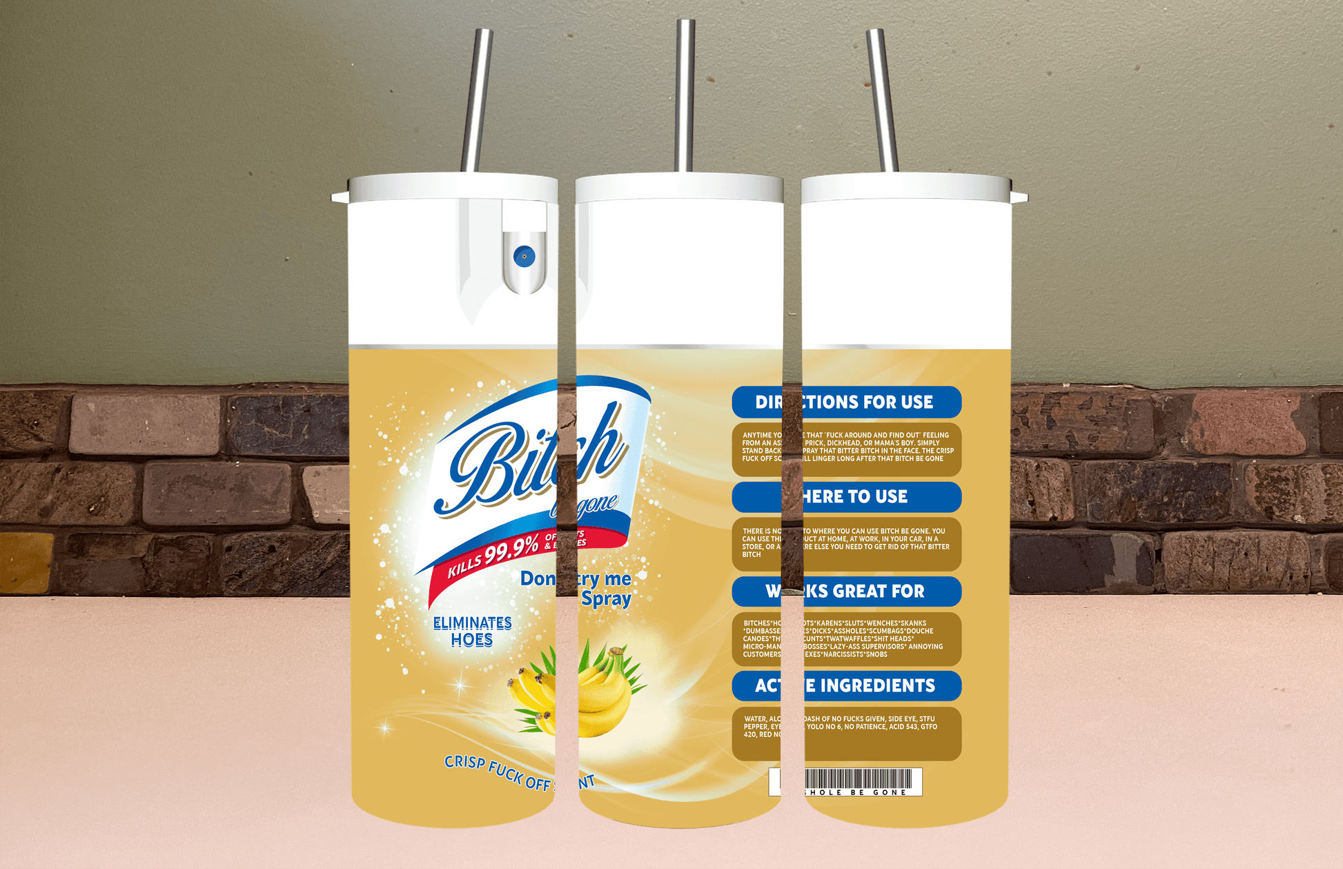 Say goodbye to bad vibes with this “Bitch Be Gone” parody tumbler! Designed to look like a cleaning spray bottle, this tumbler is covered in funny details like “Eliminates Hoes,” “Crisp F** Off Scent,”* and tongue-in-cheek “Directions for Use.” With its bright yellow lemon-clean design, it’s guaranteed to get laughs wherever you go.